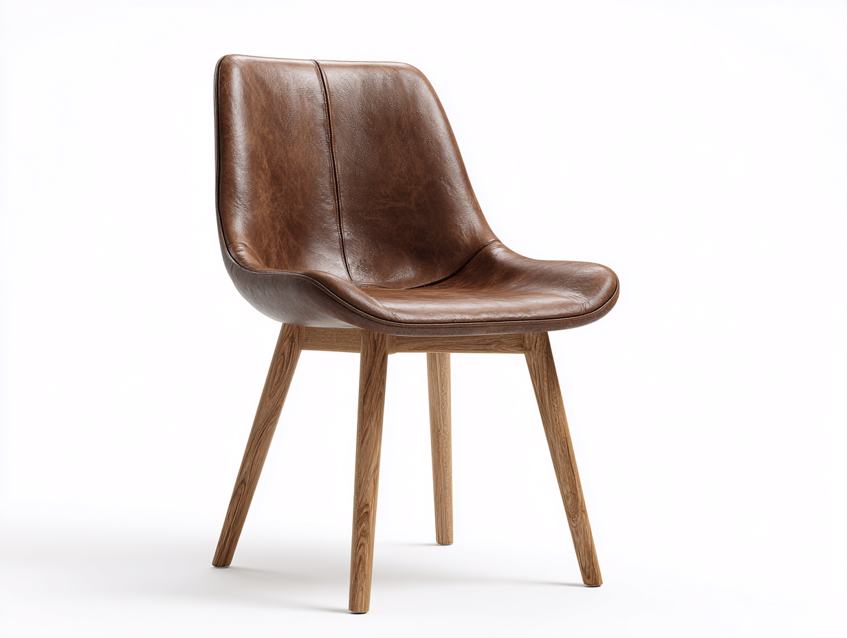 Seduta e schienale sono rivestiti in ecopelle di colore marrone, con superficie liscia e leggermente texturizzata. La struttura è sostenuta da gambe in legno massello con finitura naturale, accuratamente lavorate per garantire stabilità e durata.